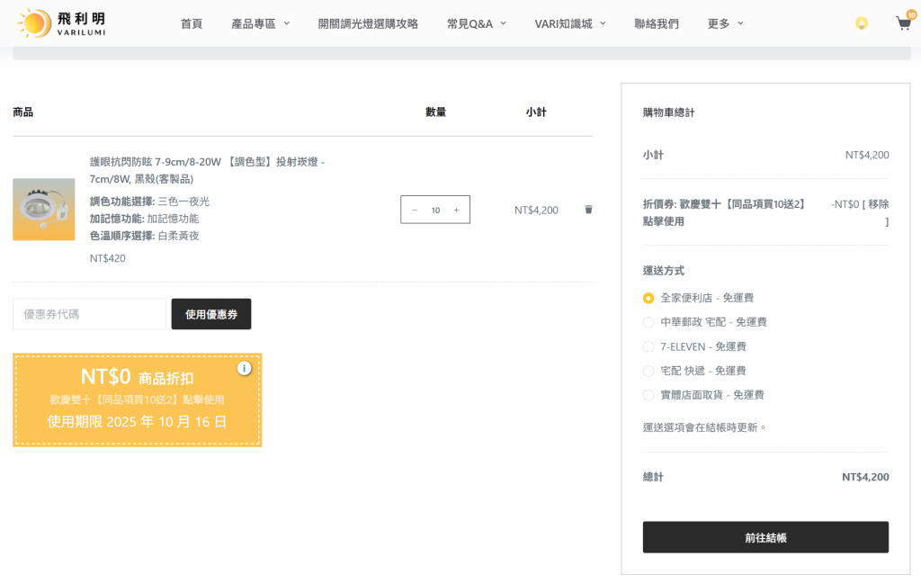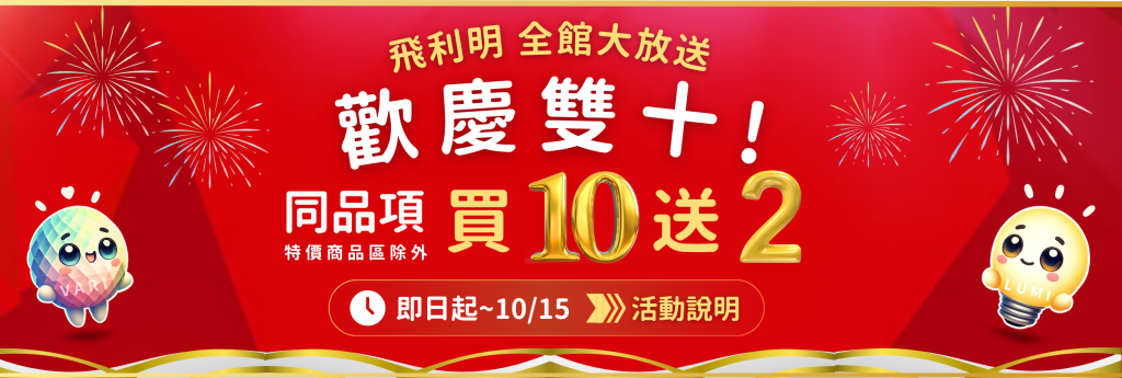 - 同燈具品項、同功能、同色溫(同時符合以上三點)之產品,即享有「買10送2」特惠