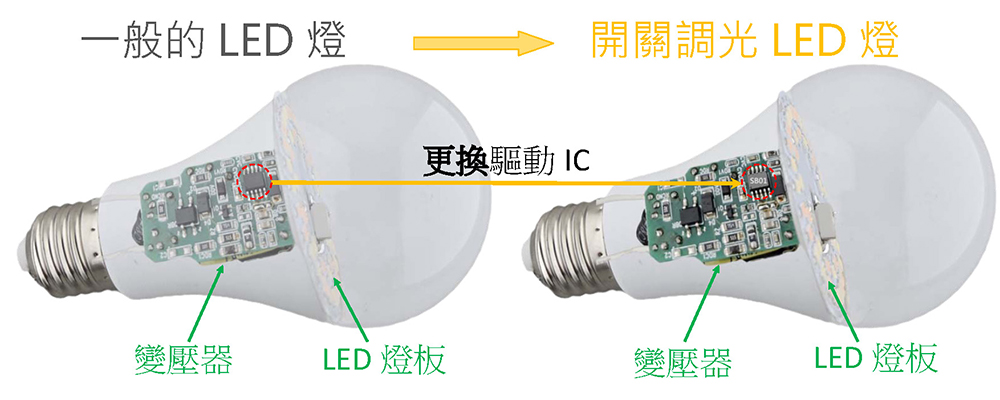 LED 燈裡都有一顆變壓器,而變壓器裡包含了「驅動 IC」這個零件,飛利明讓這顆驅動 IC 增加了依據開關切換來改變亮度的能力。
